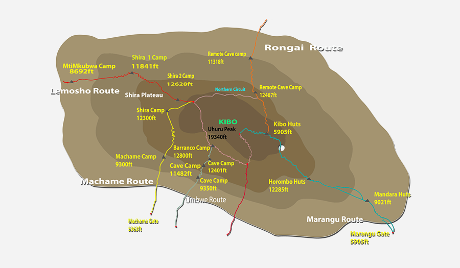 There are seven established routes to climb Mount Kilimanjaro – Marangu, Machame, Lemosho, Shira, Rongai, Northern Circuit and Umbwe. The Marangu, Machame, and Umbwe routes all approach from the south of the mountain (Mweka is used only for descent). The Lemosho, Shira and Northern Circuit routes approach from the west. The Rongai route approaches from the north. The illustrations below depict a three-dimensional view of Kilimanjaro’s climbing routes and a close up of the approaches to the summit.