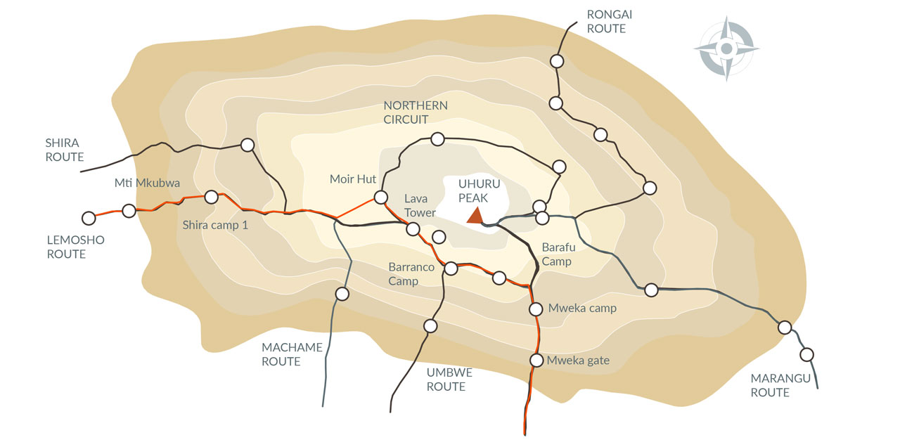 The route approaches Mount Kilimanjaro from the west, beginning with a long drive from Moshi to Londorossi Gate. From there, the first two days are spent trekking through the rainforest to Shira Ridge, before crossing the Shira Plateau. The route then heads north and circles clockwise from Moir Hut to Buffalo Camp to School Hut, before summiting from the east. Descend is made via the Mweka route.